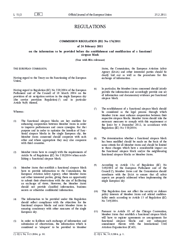 This Regulation specifies the information to be provided by EU Member States before the establishment and modification of a functional airspace block