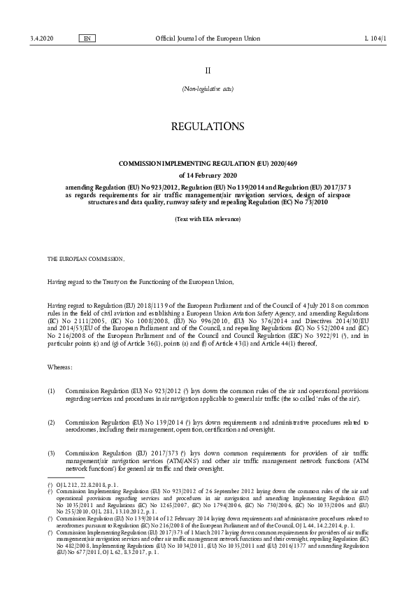 Regulation 2020/469 amending Regulations 923/2012, 139/2014 and 2017/373 and repealing Regulation 73