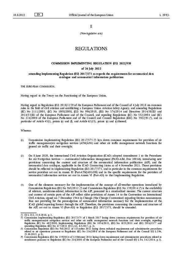COMMISSION IMPLEMENTING REGULATION (EU) 2022/938 of 26 July 2022 amending Implementing Regulation (EU) 2017/373 as regards the requirements for aeronautical data catalogue and aeronautical information publication.