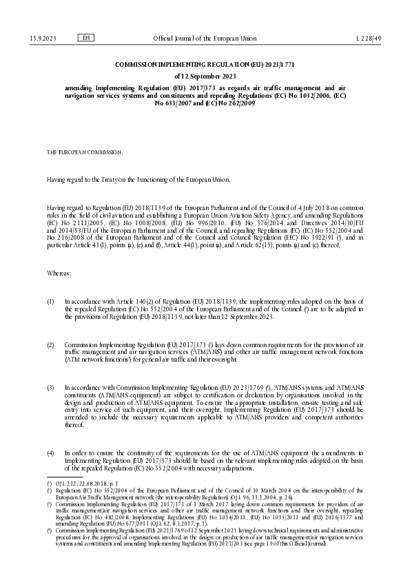 COMMISSION IMPLEMENTING REGULATION (EU) 2023/1771 of 12 September 2023 amending Implementing Regulation (EU) 2017/373 as regards air traffic management and air navigation services systems and constituents and repealing Regulations (EC) No 1032/2006, (EC) No 633/2007 and (EC) No 262/2009