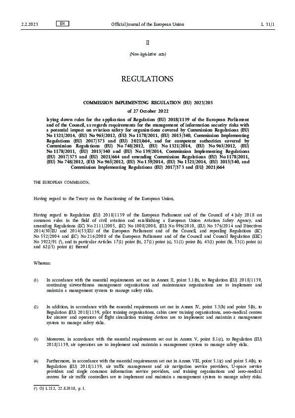 COMMISSION IMPLEMENTING REGULATION (EU) 2023/203 of 27 October 2022 laying down rules for the application of Regulation (EU) 2018/1139 of the European Parliament and of the Council, as regards requirements for the management of information security risks with a potential impact on aviation safety for organisations covered by Commission Regulations (EU) No 1321/2014, (EU) No 965/2012, (EU) No 1178/2011, (EU) 2015/340, Commission Implementing Regulations (EU) 2017/373 and (EU) 2021/664, and for competent authorities covered by Commission Regulations (EU) No 748/2012, (EU) No 1321/2014, (EU) No 965/2012, (EU) No 1178/2011, (EU) 2015/340 and (EU) No 139/2014, Commission Implementing Regulations (EU) 2017/373 and (EU) 2021/664 and amending Commission Regulations (EU) No 1178/2011, (EU) No 748/2012, (EU) No 965/2012, (EU) No 139/2014, (EU) No 1321/2014, (EU) 2015/340, and Commission Implementing Regulations (EU) 2017/373 and (EU) 2021/664.