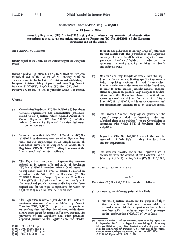 Commission Regulation (EU) No 83/2014 Amending Regulation (EU) No 965/2012 laying down technical requirements and administrative procedures related to air operations pursuant to Regulation (EC) No 216/2008 of the European Parliament and of the Council