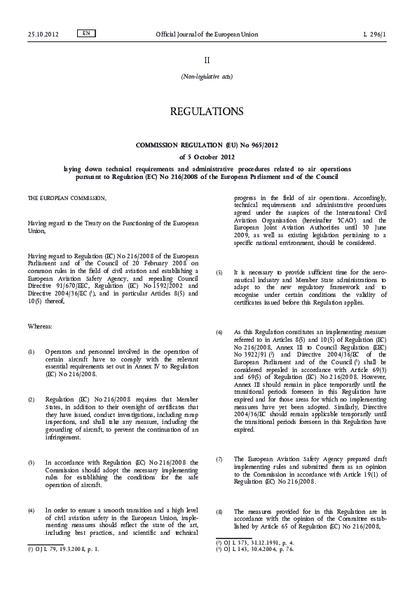 Regulation (EC) 965/2012 laying down technical requirements and administrative procedures related to air operations pursuant to Regulation (EC) 216/2008
