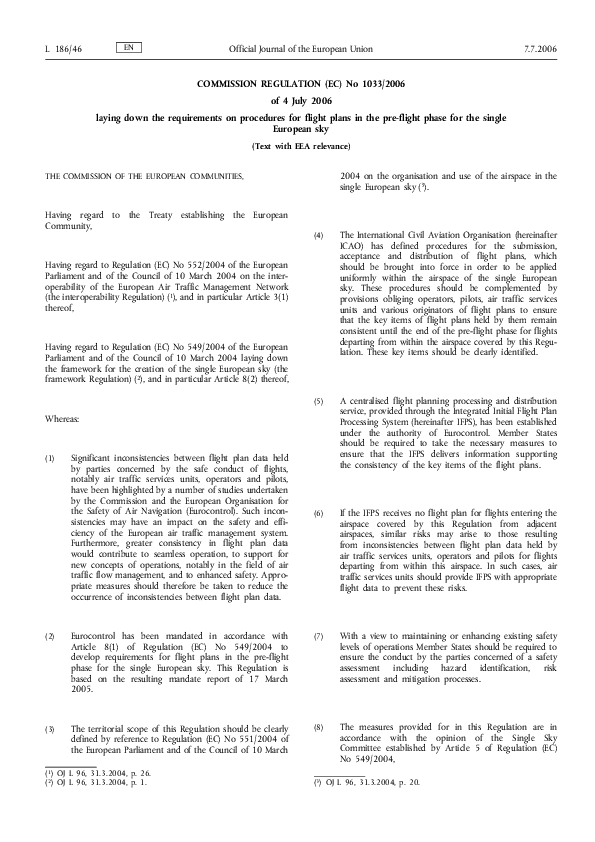 Regulation (EC) No 1033/2006 of 4 July 2006 laying down the requirements on procedures for flight pl