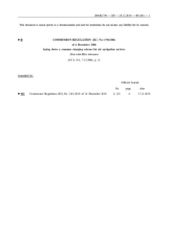 Regulation No 1794/2006 of 6 December 2006 laying down a common charging scheme for air navigation services in Europe as amended by Commission Regulation (EU) No 1191/2010 of 16 December 2010