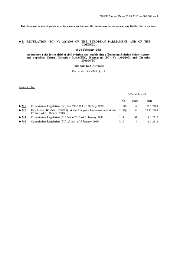 This is a consolidated version of Regulation 216/2008, amended by: * Regulation 690/2009 * Regulation 1108/2009 * Regulation 6/2013 * Regulation 2016/4