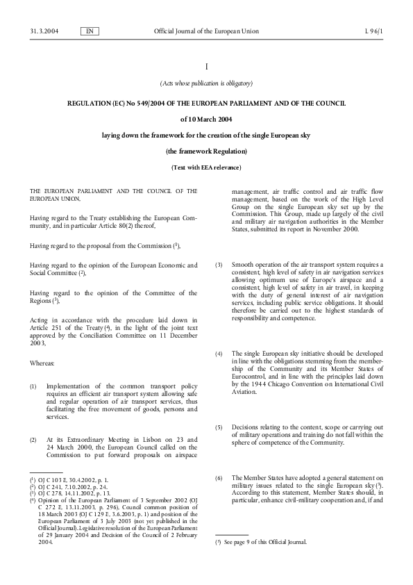 Regulation (EC) No 549/2004 of the European Parliament and of the Council laying down the framework