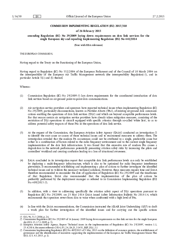 Regulation EU 2015/310 amending Regulation (EC) No 29/2009 laying down requirements on data link ser