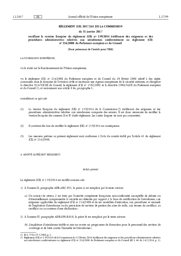 COMMISSION REGULATION (EU) 2017/161 of 31 January 2017 correcting the French language version of Regulation (EU) No 139/2014 laying down requirements and administrative procedures related to aerodromes pursuant to Regulation (EC) No 216/2008 of the European Parliament and of the Council