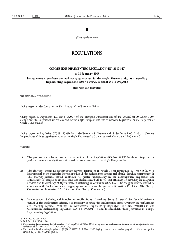 COMMISSION IMPLEMENTING REGULATION (EU) 2019/317 of 11 February 2019 laying down a performance and charging scheme in the single European sky and repealing Implementing Regulations (EU) No 390/2013 and (EU) No 391/2013