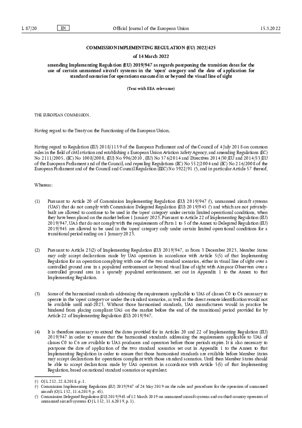 COMMISSION IMPLEMENTING REGULATION (EU) 2022/425 of 14 March 2022 amending Implementing Regulation (EU) 2019/947 as regards postponing the transition dates for the use of certain unmanned aircraft systems in the ‘open’ category and the date of application for standard scenarios for operations executed in or beyond the visual line of sight