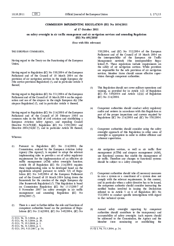 COMMISSION IMPLEMENTING REGULATION (EU) No 1034/2011 of 17 October 2011 on safety oversight in air traffic management and air navigation services and amending Regulation (EU) No 691/2010
