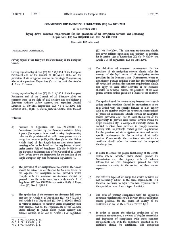 Commission Implementing Regulation (EU) No 1035/2011 of 17 October 2011 laying down common requirements for the provision of air navigation services and amending Regulations (EC) No 482/2008 and (EU) No 691/2010