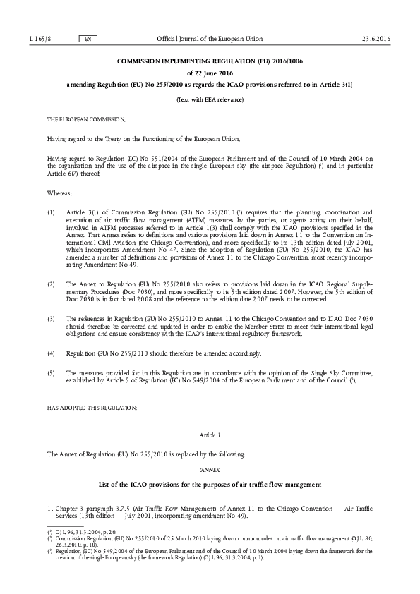 Regulation (EU) No 2016/1006 amending Regulation 255/2010 as regards ICAO provisions