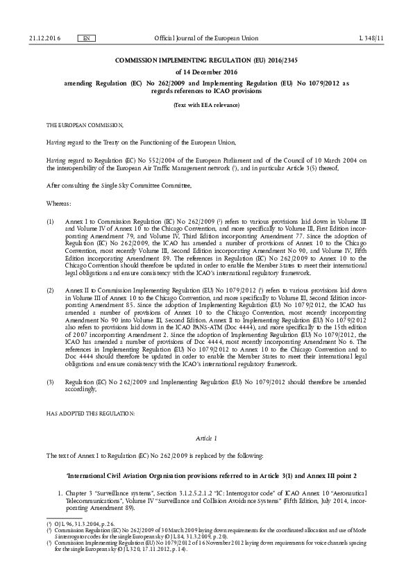 COMMISSION IMPLEMENTING REGULATION (EU) 2016/2345 of 14 December 2016 amending Regulation (EC) No 262/2009 and Implementing Regulation (EU) No 1079/2012 as regards references to ICAO provisions
