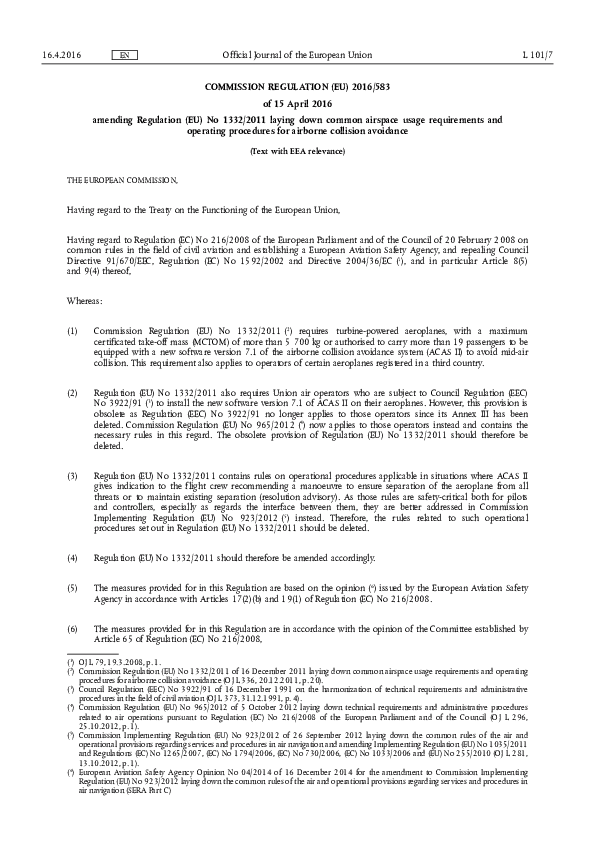 Regulation (EU) No 2016/583 amending Regulation 1332/2011 for airborne collision avoidance