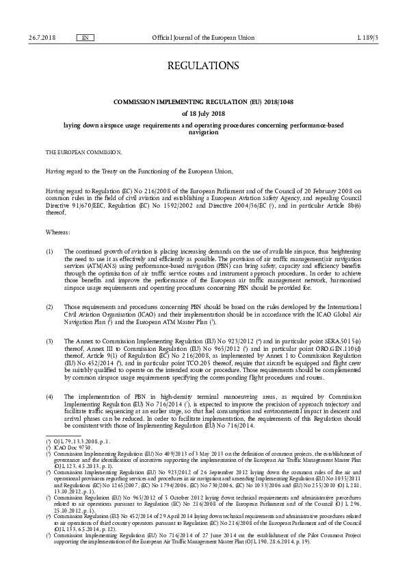 Regulation (EU) No 2018/1048 - Airspace Usage Requirements and Operating Procedures Concerning PBN
