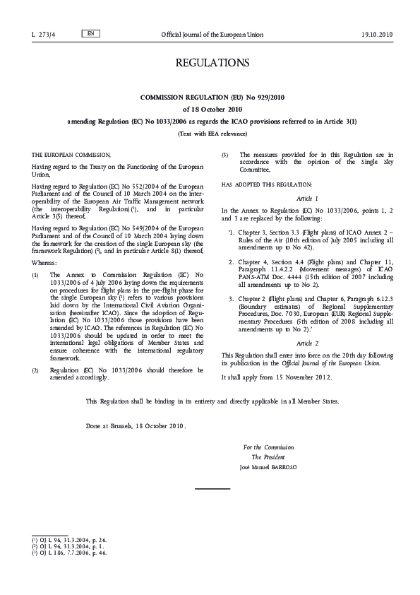In the Annex to Regulation (EC) No 1033/2006, points 1, 2 and 3 are replaced by the following: 1. Chapter 3, Section 3.3 (Flight plans) of ICAO Annex 2 Rules of the Air (10th edition of July 2005 including all amendments up to No 42). 2. Chapter 4, Section 4.4 (Flight plans) and Chapter 11, Paragraph 11.4.2.2 (Movement messages) of ICAO PANS-ATM Doc. 4444 (15th edition of 2007 including all amendments up to No 2). 3. Chapter 2 (Flight plans) and Chapter 6, Paragraph 6.12.3 (Boundary estimates) of Regional Supplementary Procedures, Doc. 7030, European (EUR) Regional Supplementary Procedures (5th edition of 2008 including all amendments up to No 2).’