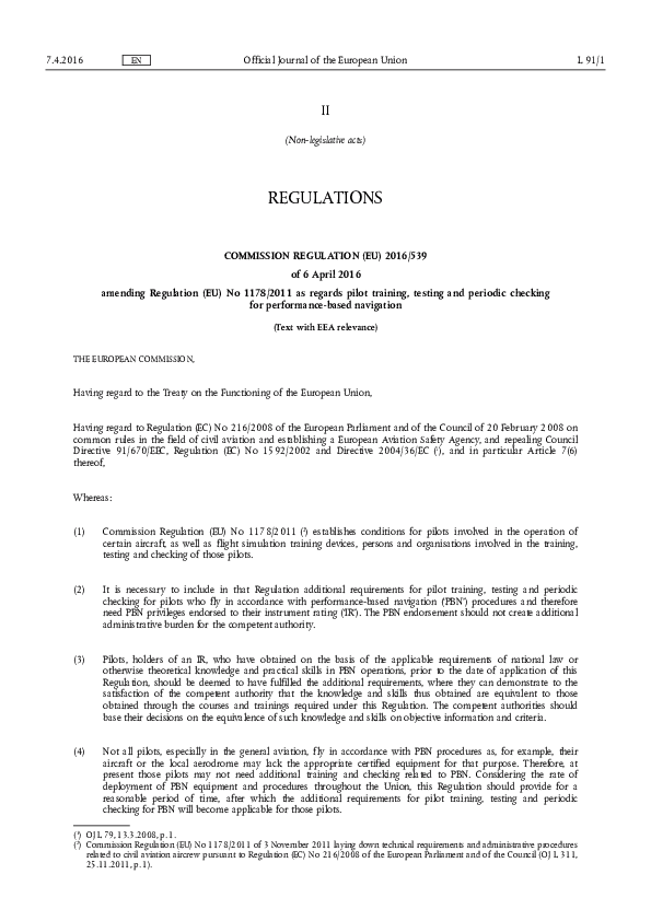 Regulation (EU) No (EU) 2016/539: Pilot training, testing and checking for PBN