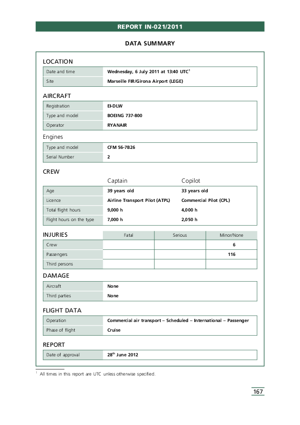 Report IN-021/2011, B738, in flight crew incapacitation, Marseille France, 6 July 2011