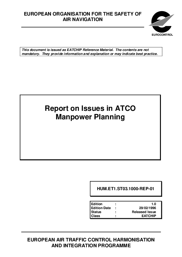 The document describes the process of manpower planning and addresses strategic as well as tactical planning constituents and associated planning problems that have a direct or indirect influence on the planning of quantitative manpower requirements in Air Traffic Service (ATS). Mandatory and complementary elements in staffing that normally are related to the calculation of staffing or multiplication factors and therefore have a direct influence on the number of staff needed to man operational positions are identified and described.