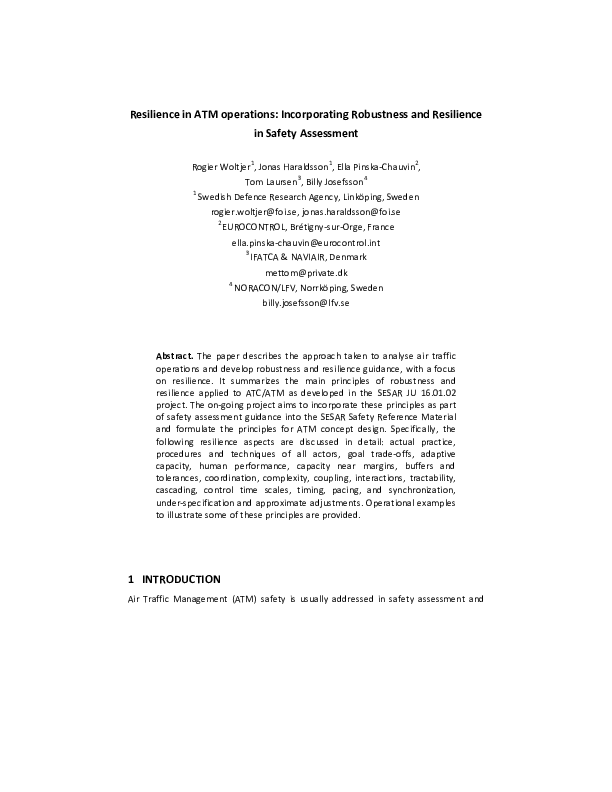 The paper describes the approach taken to analyse air traffic operations and develop robustness and resilience guidance, with a focus on resilience. It summarizes the main principles of robustness and resilience applied to ATC/ATM as developed in the SESAR JU 16.01.02 project. The on-Âgoing project aims to incorporate these principles as part of safety assessment guidance into the SESAR Safety Reference Material and formulate the principles for ATM concept design. Specifically, the following resilience aspects are discussed in detail: actual practice, procedures and techniques of all actors, goal trade-Âoffs, adaptive capacity, human performance, capacity near margins, buffers and tolerances, coordination, complexity, coupling, interactions, tractability, cascading, control time scales, timing, pacing, and synchronization, under-Âspecification and approximate adjustments. Operational examples to illustrate some of these principles are provided.