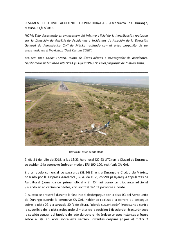 This document is a short version of the official investigation of the Dirección de Análisis de Accidentes e Incidentes de Aviación de la Dirección\r\nGeneral de Aeronáutica Civil de México and it is created only for the purpose of the ES2 2020 edition.