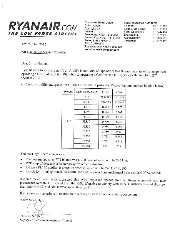 Ryanair Cost Index Policy, effective from 27 Oct 2012