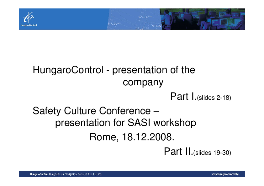 This presentation provides informations about the steps towards implementing a Safety Culture in HungaroControl, including the Safety Culture Survey experience, which is a good measure of the effectiveness and the results of Safety Management System in an organisation.