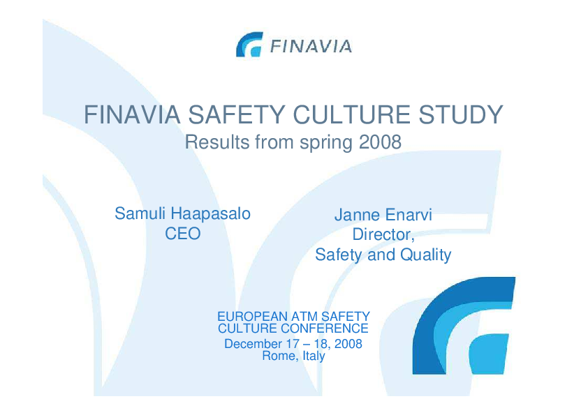 This presentation contains the overview of the safety culture study applied in FINAVIA: the main objectives of the study,the results, some concerns and conclusions.