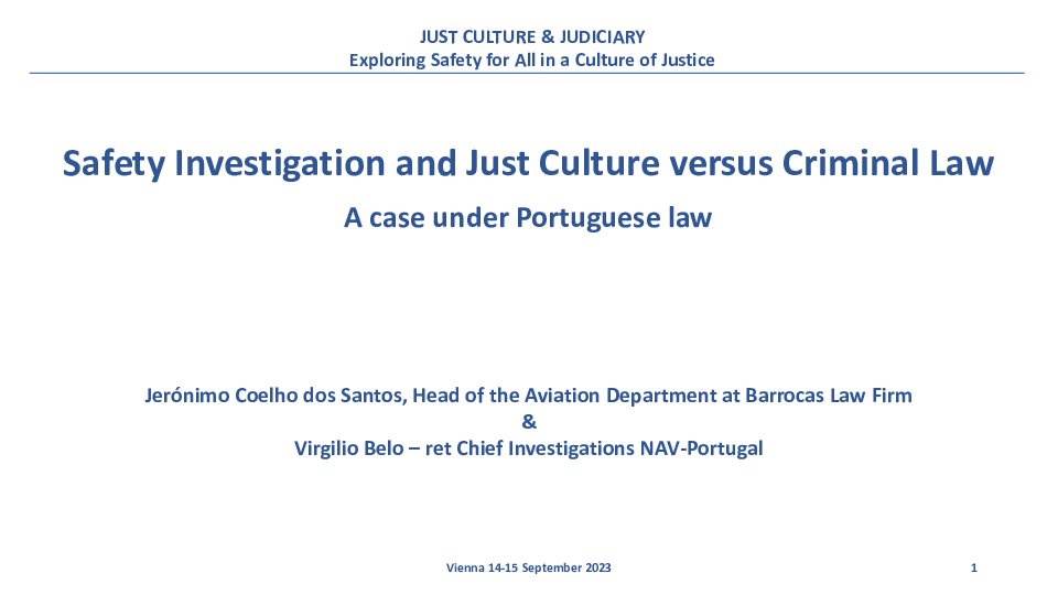 A presentation titled "Safety Investigation and Just Culture versus Criminal Law", presented on 15 September 2023 as part of the 2023 Just Culture conference titled "Just Culture & the Judiciary - Exploring Safety for all in a Culture of Justice".
