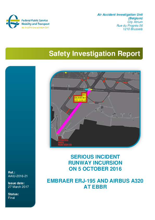 Safety Investigation Report - Runway Incrusion E195 & A320, Brussels Belgium, 5 Oct 2016