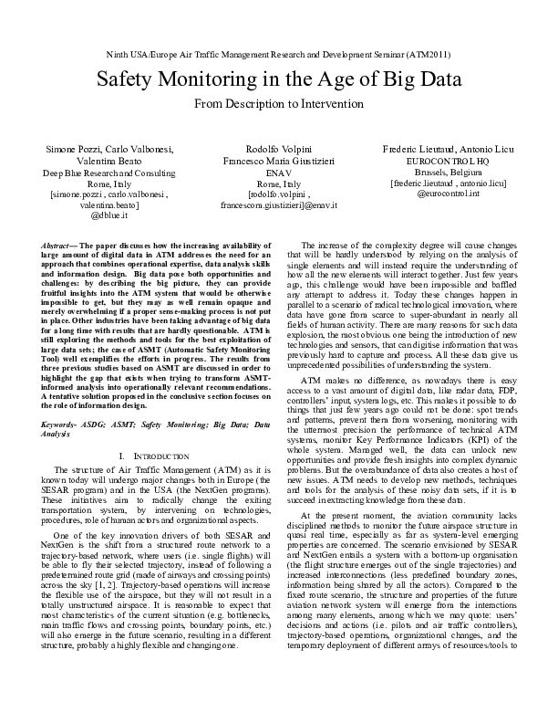 The paper discusses how the increasing availability of large amount of digital data in ATM addresses the need for an approach that combines operational expertise, data analysis skills and information design. Big data pose both opportunities and challenges: by describing the big picture, they can provide fruitful insights into the ATM system that would be otherwise impossible to get, but they may as well remain opaque and merely overwhelming if a proper sense-making process is not put in place. Other industries have been taking advantage of big data for a long time with results that are hardly questionable. ATM is still exploring the methods and tools for the best exploitation of large data sets; the case of ASMT (Automatic Safety Monitoring Tool) well exemplifies the efforts in progress. The results from three previous studies based on ASMT are discussed in order to highlight the gap that exists when trying to transform ASMTinformed analysis into operationally relevant recommendations.\r\nA tentative solution proposed in the conclusive section focuses on the role of information design.\r\n