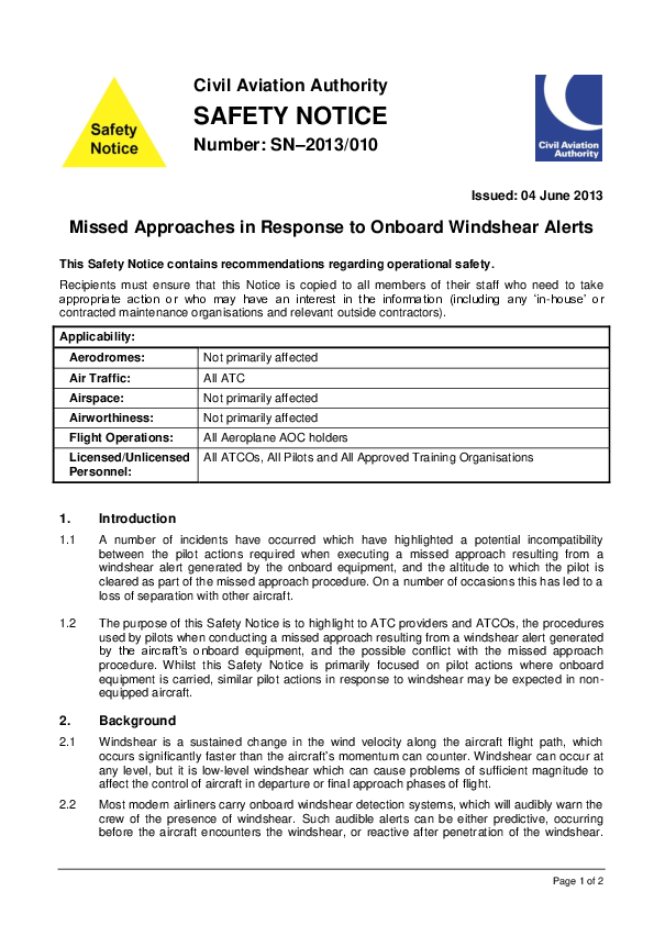 Safety Notice: Missed Approaches in Response to Onboard Windshear Alerts, 04 June 2013