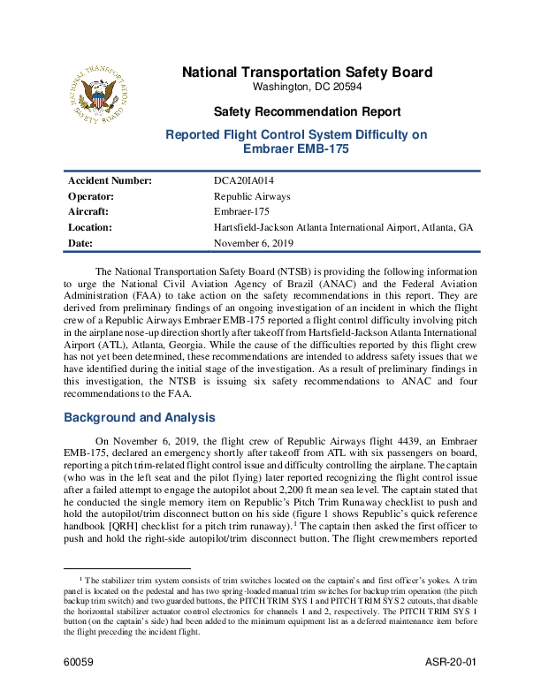 DCA201A014 Safety Recommendation Report: Reported Flight Control System Dificulty on Embraer EMB-175 which took place on 6 Nov 2019