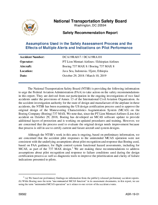 The National Transportation Safety Board (NTSB) is providing the following information to urge the Federal Aviation Administration (FAA) to take action on the safety recommendations in this report. They are derived from our participation in the ongoing investigations of two fatal accidents under the provisions of Annex 13 of the International Civil Aviation Organization. As the accident investigation authority for the state of design and manufacture of the airplane in these accidents, the NTSB has been examining the US design certification process used to approve the original design of the Maneuvering Characteristics Augmentation System (MCAS) on the Boeing Company (Boeing) 737MAX. We note that, since the PT Lion Mentari Airlines (Lion Air) accident on October 29, 2018, Boeing has developed an MCAS software update to provide additional layers of protection and is working on updated procedures and training. However, we are concerned that the process used to evaluate the original design needs improvement because that process is still in use to certify current and future aircraft and system designs.