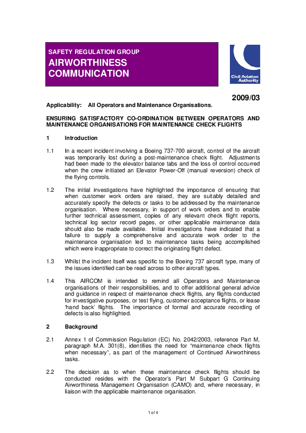 Safety Regulation Group: Airworthiness Communication 2009/03 - Applicable to all operators and maint