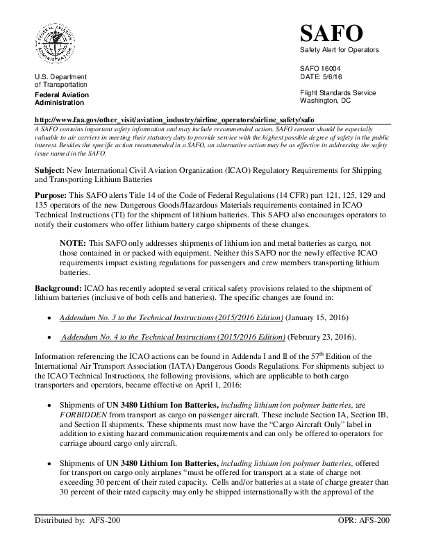 New International Civil Aviation Organization (ICAO) Regulatory Requirements for Shipping and Transporting Lithium Batteries
