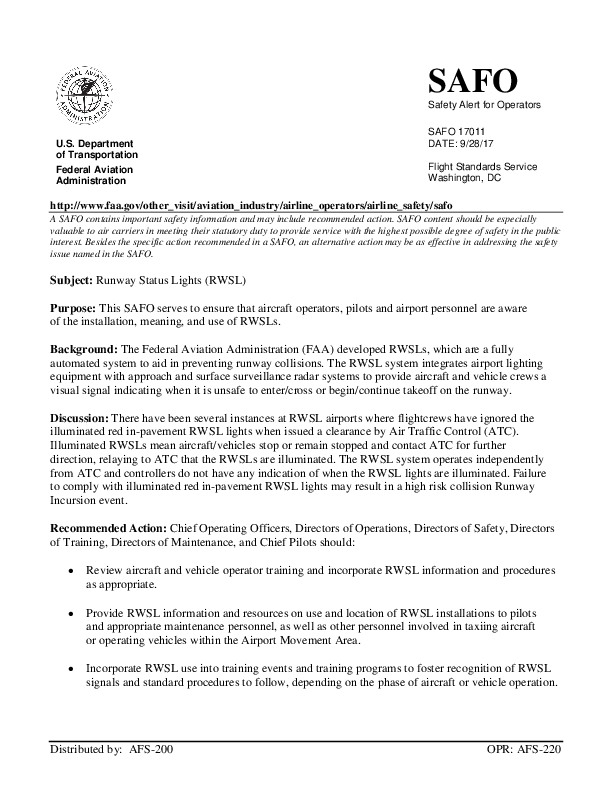 This SAFO serves to ensure that aircraft operators, pilots and airport personnel are aware of the installation, meaning, and use of RWSLs.