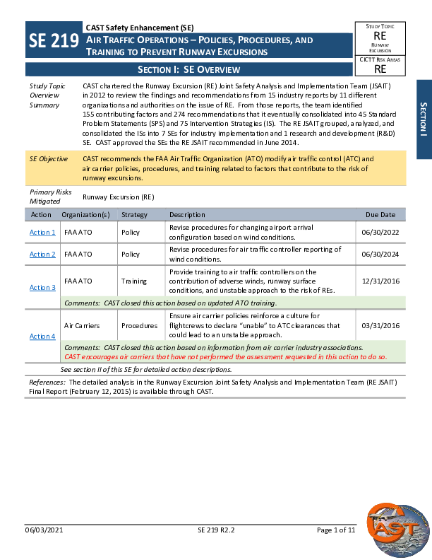 The Detailed Implementation Plan contains CAST recommendations to the FAA Air Traffic Organization (ATO) to modify air traffic control (ATC) and air carrier policies, procedures, and training related to factors that contribute to the risk of runway excursions.