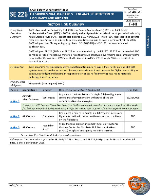 SE226 R1.5 Remaining Risk - Cargo - Hazardous Materials Fires - Enhanced Protection of Occupants and Aircraft