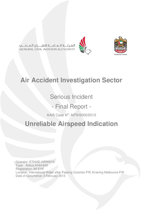Serious Incident Final Report AIFN/0005/2013 Unreliable Airspeed Indication A346 Indian Ocean 2013