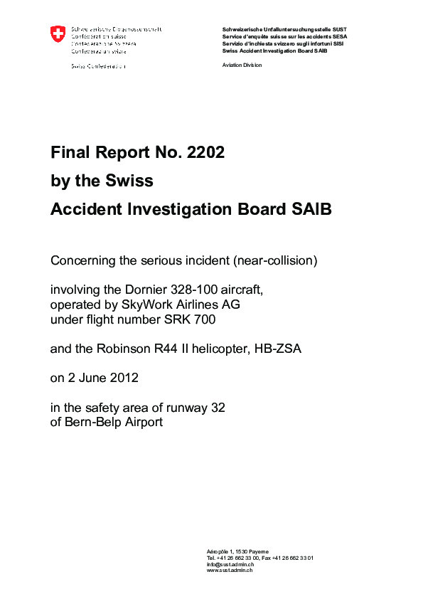 On 2 June 2012, a Dornier 328 and a commercially-operated Robinson R44 helicopter came into close proximity within the airport perimeter whilst both were departing from Bern in VMC as cleared. The Investigation attributed the conflict to inappropriate issue of clearances by the controller in a context of an absence of both a defined final approach and take off area and fixed departure routes to the three designated departure points.