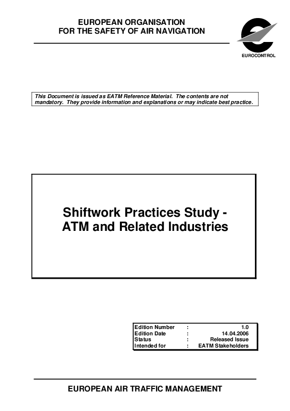 This document presents the study on shiftwork practices both in Air Traffic Management (ATM) and non-ATM industries. The purpose of the study was to identify (best) practices that can help to define common solutions for managing shiftwork in European ATM. This document is the second of the “Managing Shiftwork in European ATM (MSEA) Project, which was conducted by EUROCONTROL within the EATM Human Factors Domain as part of the Human Performance and Training Enhancement (HPTE) Planning and Feasibility. Shiftwork practices were collected from the areas of international ATM, and from the medical, police and airline industries. The findings were rich and are likely to provide valuable input to the process of developing shiftwork solutions for European ATM.