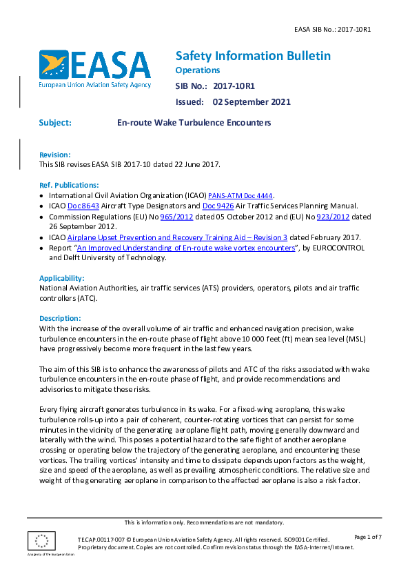 SIB 2017-10R1 : En-route Wake Turbulence Encounters