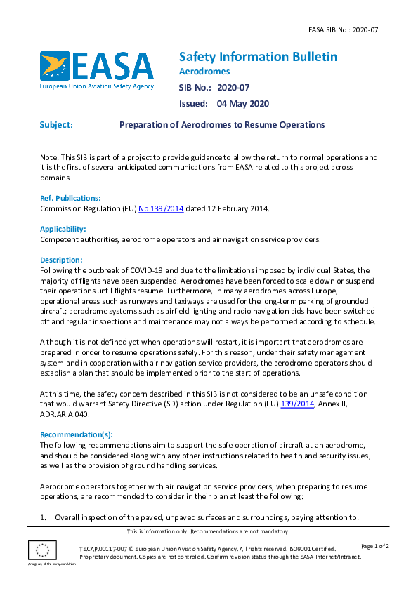 SIB 2020-07: Preparation of Aerodromes to Resume Operations