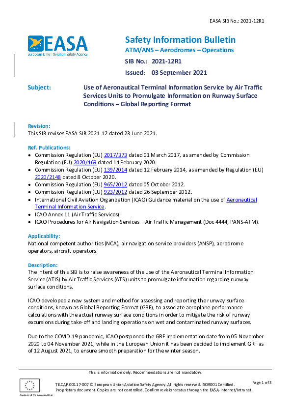 SIB 2021-12R1: Use of ATIS by ATS Units to Promulgate Information on Runway Surface Conditions – Global Reporting Format