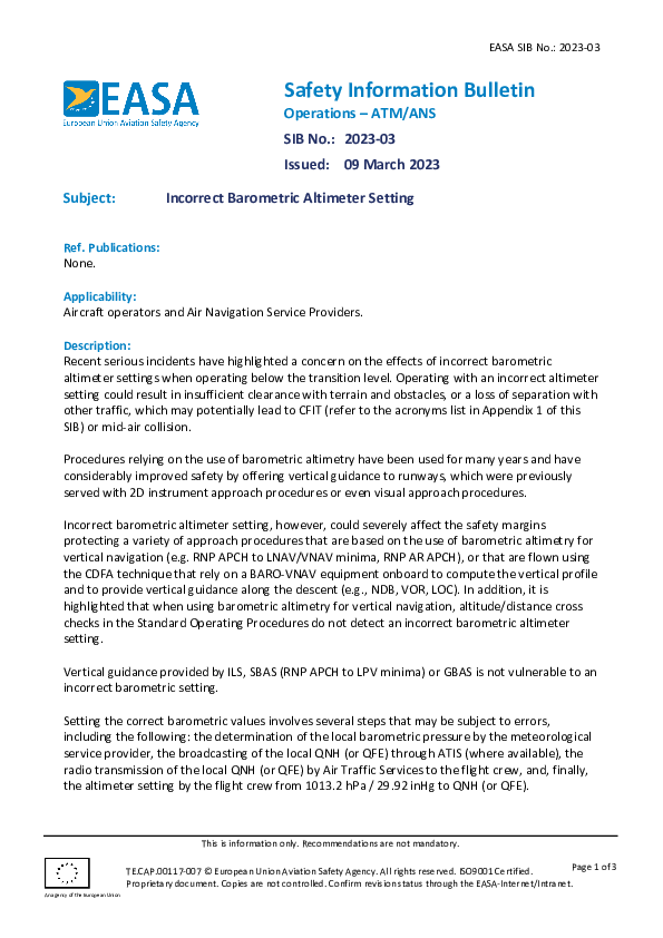 SIB 2023-03: Incorrect Barometric Altimeter Setting