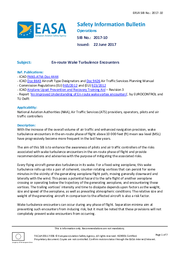 With the increase of the overall volume of air traffic and enhanced navigation precision, wake turbulence encounters in the en-route phase of flight above 10 000 feet (ft) mean sea level (MSL) have progressively become more frequent in the last few years. The aim of this SIB is to enhance the awareness of pilots and air traffic controllers of the risks associated with wake turbulence encounters in the en-route phase of flight and provide recommendations and advisories with the purpose of mitigating the associated risks.