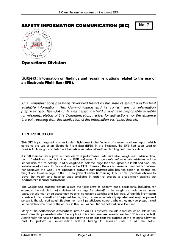 This SIC is promulgated in order to alert flight crew to the findings of a recent accident report, which concerns the use of an Electronic Flight Bag (EFB). In this instance, the EFB had been used to provide both weight and balance information and also take-off and landing performance data.